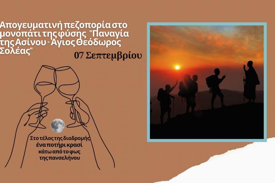 Η ομάδα του Salonica View διοργανώνει μια απογευματινή πεζοπορία με φόντο το ηλιοβασίλεμα στο μονοπάτι που ξεκινά από τον ναό της Παναγίας της Ασίνου και καταλήγει στον Άγιο Θεόδωρο Σολέας, στο υψηλότερο σημείο της διαδρομής. Εκεί, κάτω από το φως της πανσελήνου, θα κάνουμε στάση για να απολαύσουμε το κρασί μας με μοναδική θέα προς τον κόλπο της Μόρφου.