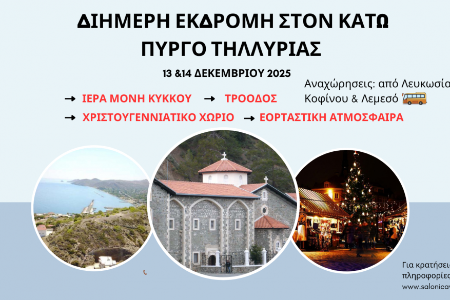 Αναχώρηση το πρωί από τη Λευκωσία (Κέντρο Κυπριακής Χειροτεχνίας) με ενδιάμεσες στάσεις επιβίβασης στην Κοφίνου και τη Λεμεσό. Στην πορεία θα κάνουμε μια σύντομη στάση στο Τρόοδος για καφέ και ξεκούραση και στη συνέχεια θα επισκεφθούμε την Ιερά Μονή Κύκκου για προσκύνημα. Αργότερα θα φτάσουμε στον προορισμό μας, τον Κάτω Πύργο Τηλλυρίας, όπου θα τακτοποιηθούμε στο ξενοδοχείο μας, E.J. Pyrgos Bay Hotel. Το υπόλοιπο της ημέρας θα είναι ελεύθερο, ώστε ο καθένας να απολαύσει με τον δικό του ρυθμό τη θάλασσα, το χωριό και την ηρεμία της περιοχής.