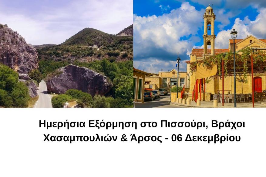 Αναχώρηση το πρωί από τη Λευκωσία (Κέντρο Κυπριακής Χειροτεχνίας), με ενδιάμεσες στάσεις επιβίβασης στην Κοφίνου και στη Λεμεσό. Πρώτη στάση στο Πισσούρι, στο κέντρο του χωριού, όπου θα έχουμε χρόνο για καφέ και μια σύντομη βόλτα. Στη συνέχεια θα διασχίσουμε την κοιλάδα του Διαρίζου, απολαμβάνοντας το ιδιαίτερο φυσικό τοπίο της περιοχής. Ακολούθως θα κατευθυνθούμε προς τους Βράχους των Χασαμπουλιών, μια εντυπωσιακή τοποθεσία κατάλληλη για στάση και φωτογραφίες. Η εκδρομή μας συνεχίζεται στο Άρσος, όπου θα πραγματοποιήσουμε προσκύνημα στην Ιερά Μονή Παναγίας Καθολικής. Θα ακολουθήσει σύντομη ομιλία από τη μοναχή, ενώ η πρόσβαση στη Μονή γίνεται μέσω μιας ευχάριστης πορείας περίπου 300 μέτρων. Μετά το προσκύνημα, θα έχουμε ελεύθερο χρόνο στο Άρσος για περιήγηση, φαγητό ή καφέ στα παραδοσιακά σημεία του χωριού.