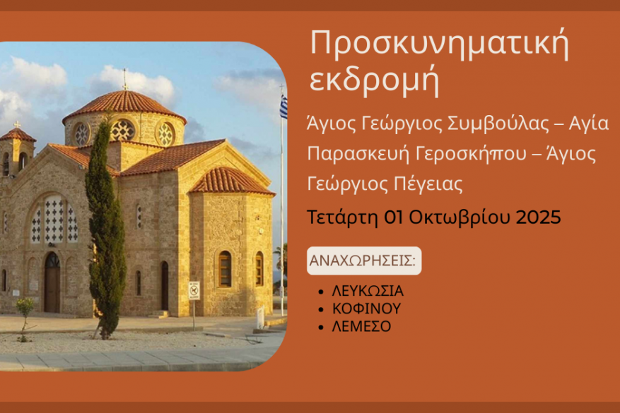 Η ομάδα μας θα ξεκινήσει από τη Λευκωσία (Κέντρο Κυπριακής Χειροτεχνίας) το πρωί. Στη συνέχεια, θα γίνει επιβίβαση με πρώτη στάση την Κοφίνου και μετά στάση στη Λεμεσό. Η πρώτη μας στάση θα είναι η Ιερά Μονή Συμβούλου Χριστού, αφιερωμένη στον Άγιο Γεώργιο τον Τροπαιοφόρο, που βρίσκεται μεταξύ της κοινότητας Σωτήρας Λεμεσού και των Αγγλικών Βάσεων Επισκοπής. Στη συνέχεια θα κατευθυνθούμε στο κέντρο της Γεροσκήπου, 3,5 χιλιόμετρα ανατολικά της Πάφου για να επισκεφθούμε την εκκλησία της Αγίας Παρασκεύης. Η εκκλησία είναι ένας από τους σημαντικότερους βυζαντινούς ναούς της Κύπρου, χρονολογούμενη από τον 9ο αιώνα. Τελευταίος μας προορισμός θα έιναι η εκκλησία του Αγίου Γεωργίου στην Πέγεια. Στο τέλος της εκδρομής μας θα πάμε για φαγητό στην Πέγεια. Στη συνέχεια θα πάμε για καφέ και ξεκούραση στον Κάθηκα πριν από την επιστροφή μας στη Λευκωσία.